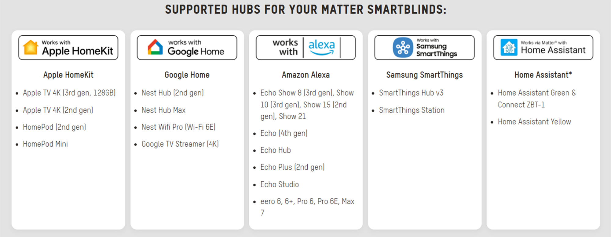 Simply smarter – Eve Motionblinds works with Apple HomeKit, Google Home, Amazon Alexa, and/or Samsung SmartThings with built-in technologies Matter and Thread. Providing you have an existing border router or smart device such as a smart TV, smart lighting etc, there’s no need for a bridge (Hub), registration or any cloud dependency so set-up is simple and secure.